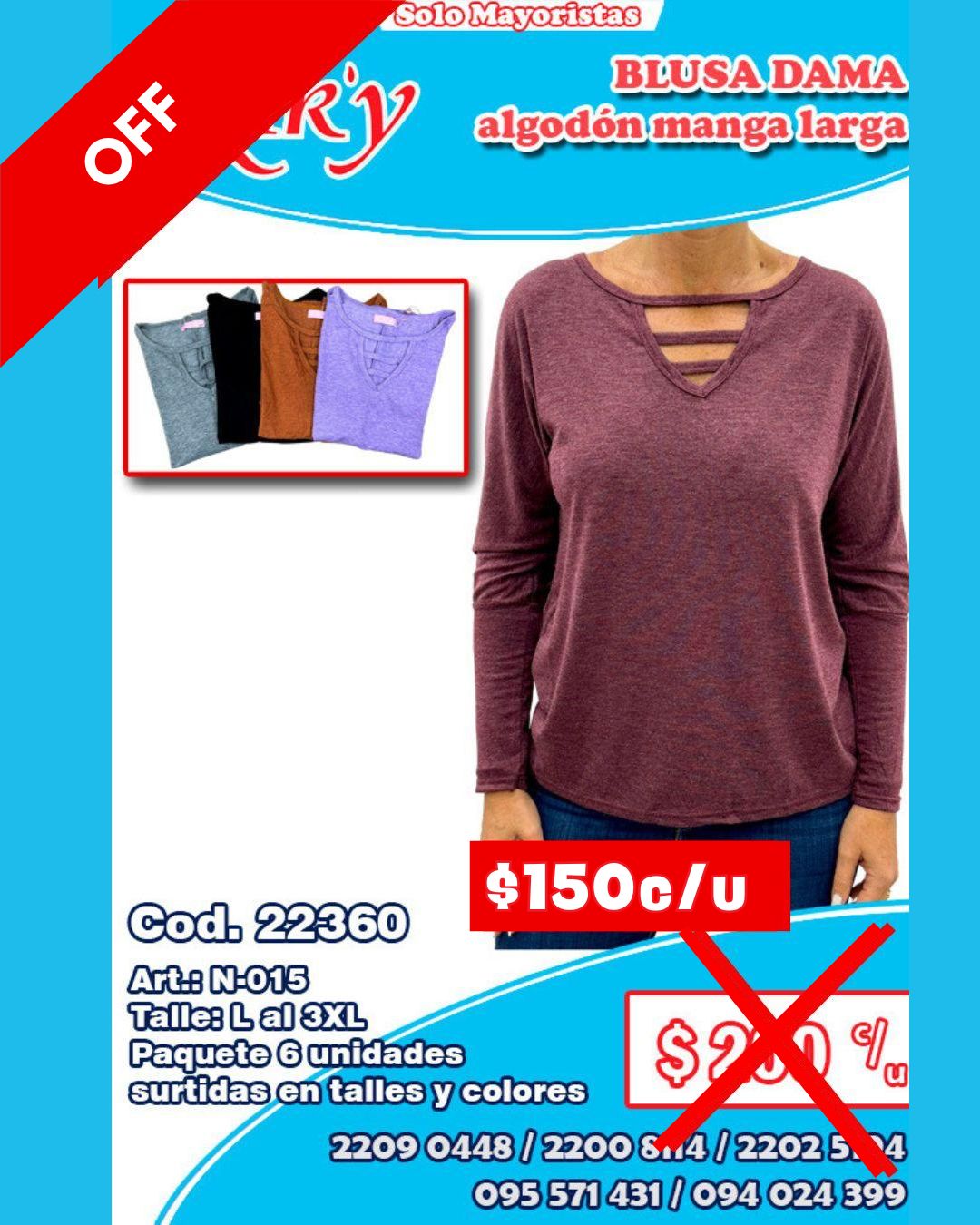 Cod. 22360 Art.: N-015 Talles: L al 3XL Paquete 6 unidades surtida en talles y colores Precio por unidad