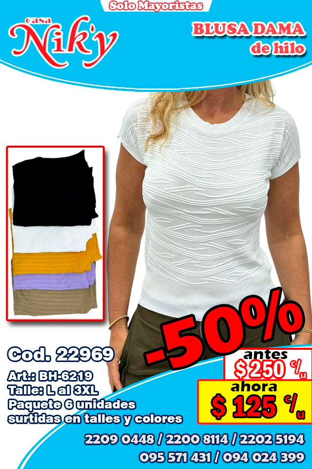 Cod. 22941 Art.: BH-6219 Talles: L al 3XL Paquete 6 unidades surtida en talles y colores Precio por unidad