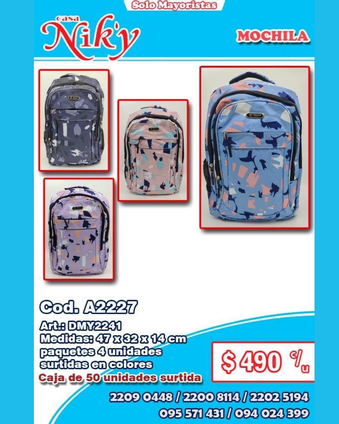 Cod. A2227 Art.: DMY2241 Medidas: 47 x 32 x 14 cm paquetes 4 unidades surtidas en colores Caja de 50 unidades surtida Precio por unidad