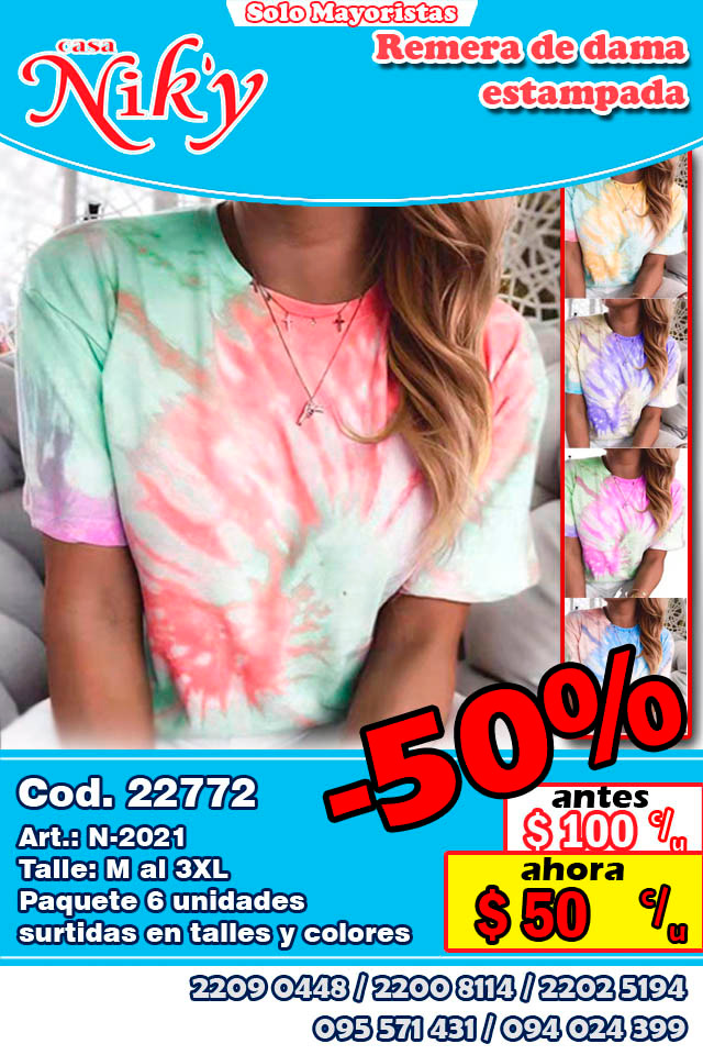 Cod. 22772 Art.: N-2021 Talle: M al 3XL Paquete 6 unidades surtidas en colores y talles Precio por unidad