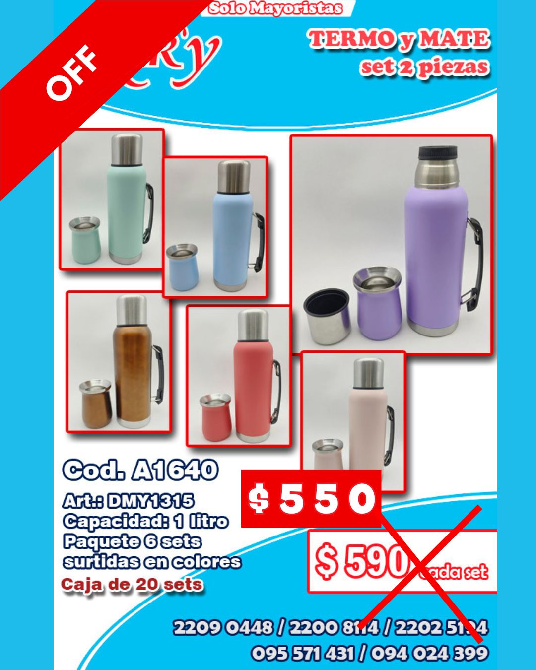 Cod. A1640 Art.: DMY1315 Capacidad: 1 litro Paquete 6 sets surtidas en colores Caja de 20 sets Precio por cada sets